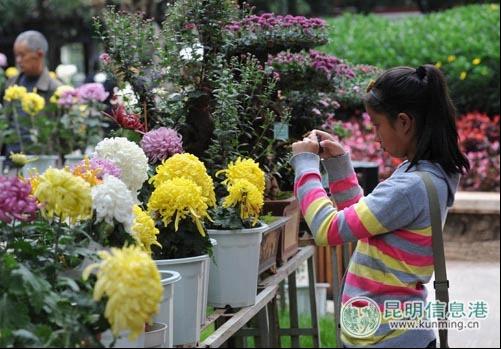 “不是花中偏愛菊,此花開後更無花”。黃金週期間,正值大觀公園第十八屆金秋菊花展, 5萬餘盆、16組造型、400多個品種的菊花迎風怒放,競相爭豔,其中不乏“綠牡丹”、“墨菊”等稀有品種,美不勝收。趁著秋高氣爽,昆明市民或闔家或攜友,賞菊留影,徜徉花海。圖為市民在鮮花前拍照留念。
